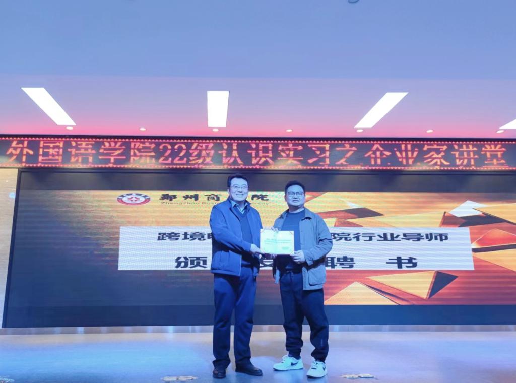 最后,赵保成副院长为两位企业家颁发了我校跨境电商行业学院行业导师聘书,并要求同学们认真总结学习企业嘉宾报告内容,优化大学学业规划,夯实英语语言基础,强化专业学习与商务能力提升,实现未来在外贸与跨境电商领域就业创业。