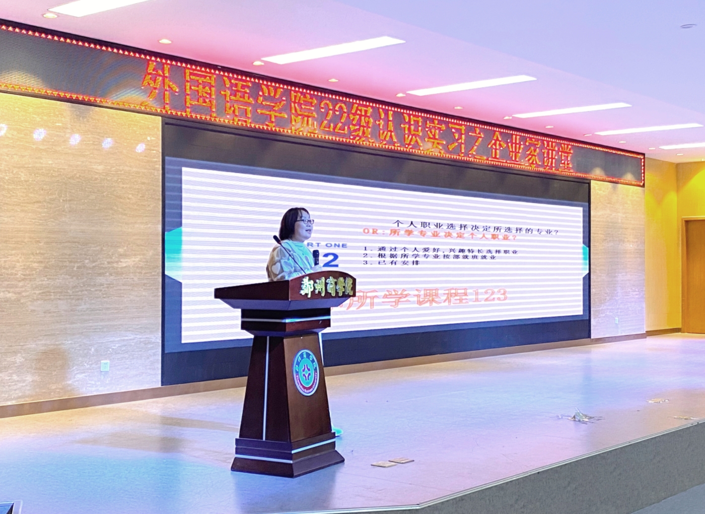 为落实产学协同育人理念,推动人才培养契合行业发展需求,实现我院高质量应用型人才培养,扎实开展专业认识实习实践教学活动,11月22日下午,我院商务英语、英语专业于紫荆西校区自力楼报告厅为22级学生举办“企业家讲堂”活动。本次企业家讲堂邀请河南绿源水处理科技有限公司总经理王景霞、阿里巴巴国际站巩义服务中心销售总监钟学茂作为主讲人。我院党委书记王克志、副院长赵保成、商务英语教研室主任葛莹辉、英语专业教研室主任程玮、就业专员兰敬高、辅导员刘宁、商务英语教研室及英语教研室负责老师、22级商务英语专业、英语学生参加了此次活动。