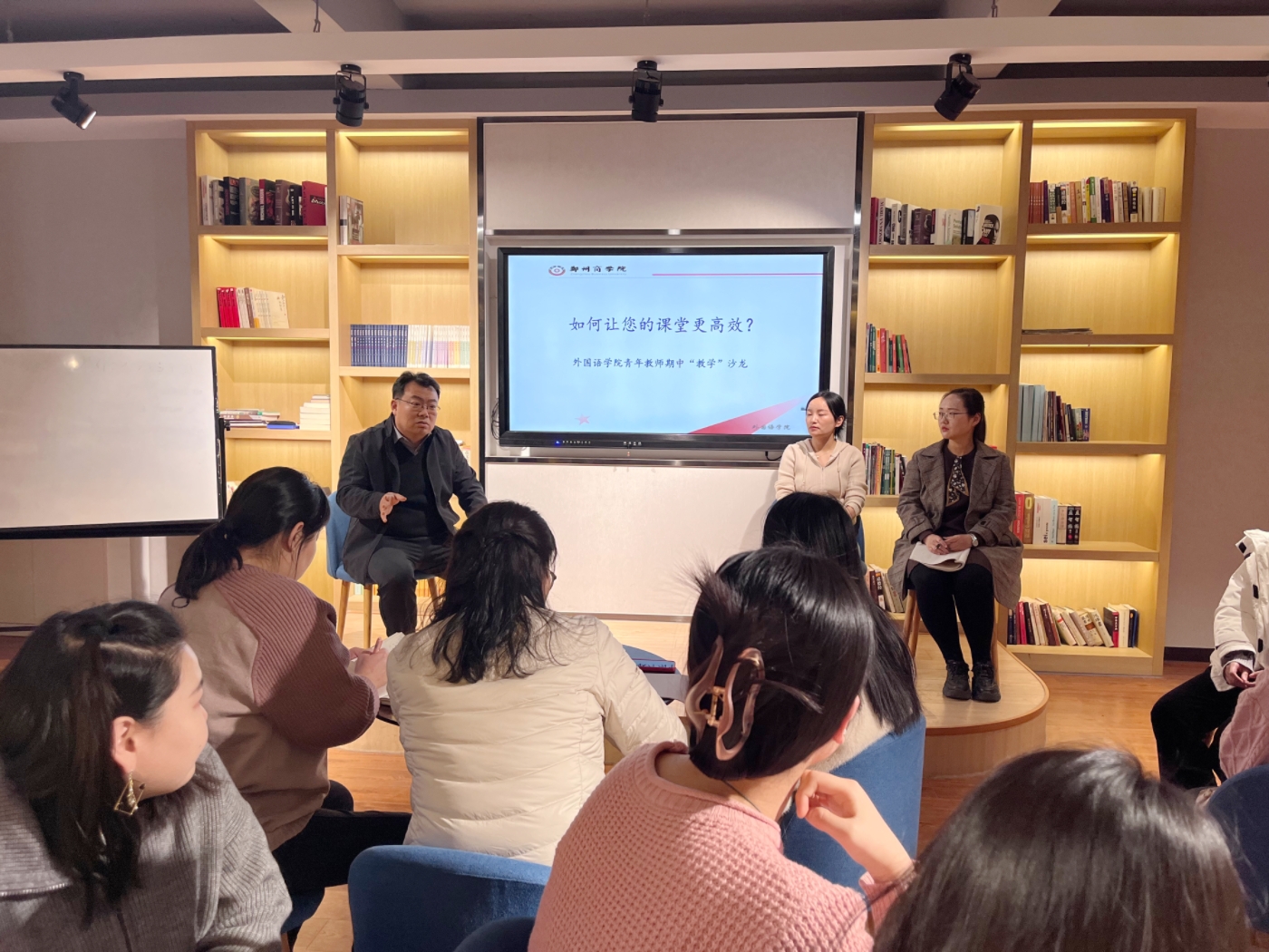 随后,座谈会进入主题讨论环节。老师们就如何增强课堂互动、教学内容及方法等问题进行了深入探讨。首先,他们讨论了如何增强课堂互动。赵院长强调了眼神互动以及走下讲台走到学生中间去。王老师分享了自己在课堂管理方面的经验以及增加游戏或练习的重要性。翟老师也分享了自己在教学内容和方法上的心得体会,她认为应该有侧重点地对教材和教学内容进行讲解,注重语境的培养,引导学生用本专业语言解释生词等。