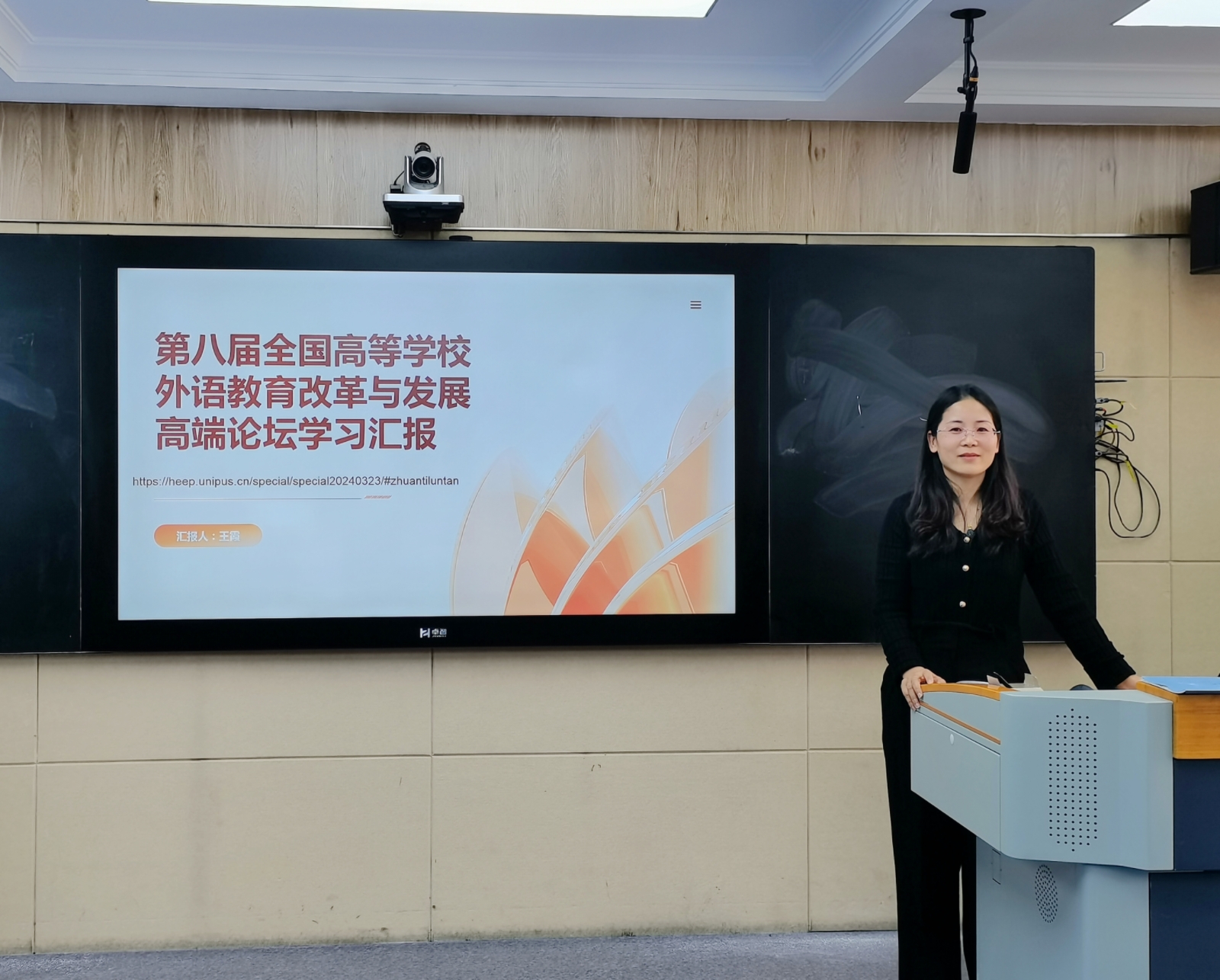 4月9日下午,我院在W104进行了第八届全国高等学校外语教育改革与发展高端论坛转训活动,由大学英语第二教研室主任王霞老师主讲,大学英语教研室全体教师参加培训。