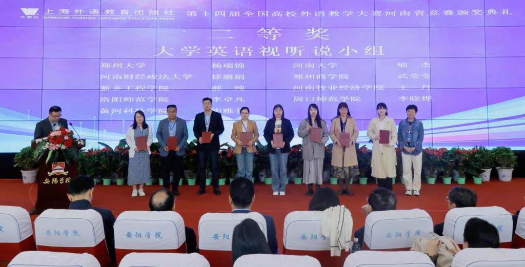 会上,还举行了第十四届“外教社杯”全国高校外语教学大赛河南赛区颁奖典礼,我院英语专业教研室教师武莹莹和韩浩分别荣获本届大赛英语视听说组及英语专业组二等奖。典礼由上海外语教育出版社、河南省教育发展中心主任蔡承浩博士主持,上海外语教育出版社社长孙玉在颁奖典礼上致辞,孙社长回顾了15年的全国高校外语教学大赛历程,同时对外语专业提出了展望。与会领导分别为获奖团队和个人颁奖。