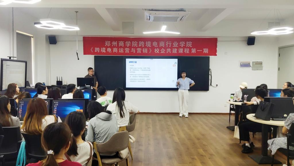 为认真落实产教协同育人理念,持续培养高质量跨境电商人才,服务地方经济高质量发展,我校跨境电商行业学院与河南澳腾环保科技有限公司联合开展的校企共建课程《跨境电商运营与营销》于5月12日在外语楼W103跨境电商实训室正式开课。跨境电商英才班60名学生参与听课学习,课程由河南澳腾环保科技有限公司企业导师主讲,外语学院王玉与李明豪老师协助课程讲授与管理。