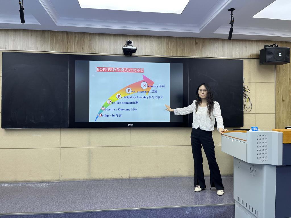 为提升我院教师教育教学水平,建设一支高素质、高质量、高水平的创新型外语教师队伍。5月21日,大学英语第一教研室在W104举办教研活动,活动由教研室主任宣菡静主持,段瑞芳老师作了题为《有效教学之BOPPPS模式》的教学分享,教研室全体教师参加会议。