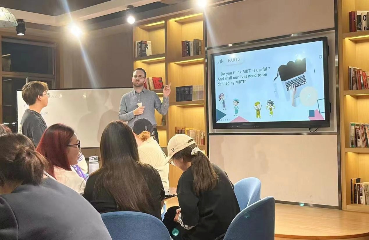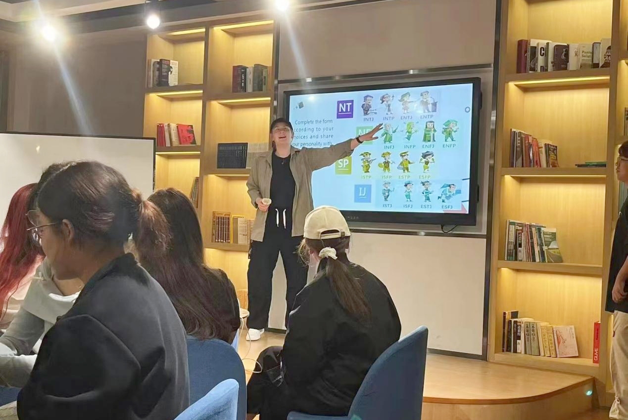 本期活动以探索自我个性为主题进行,活动主要通过进行Myers-Briggs Type Indicator测试题导入的形式展开,首先由主持人向同学们抛出问题,同学们和外教共同揭开性格的神秘面纱,探讨人格魅力,碰撞思维交流的火花,发现性格差异中的和谐与互补。在讨论的过程,同学们不仅加深了对外教的了解,也提升了自身的英语表达能力!