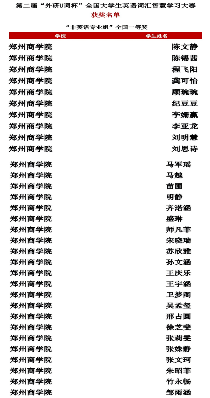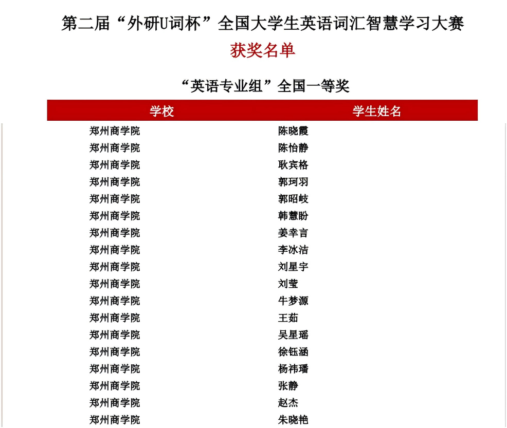 在刚刚落幕的第二届“外研U词杯”全国大学生英语词汇智慧学习大赛中,999策略白菜手机论坛的学子们凭借出色的英语词汇能力和卓越的智慧学习技巧,在全国31个省市自治区1100多所高校的十余万名参赛者中脱颖而出,以下是获奖情况: