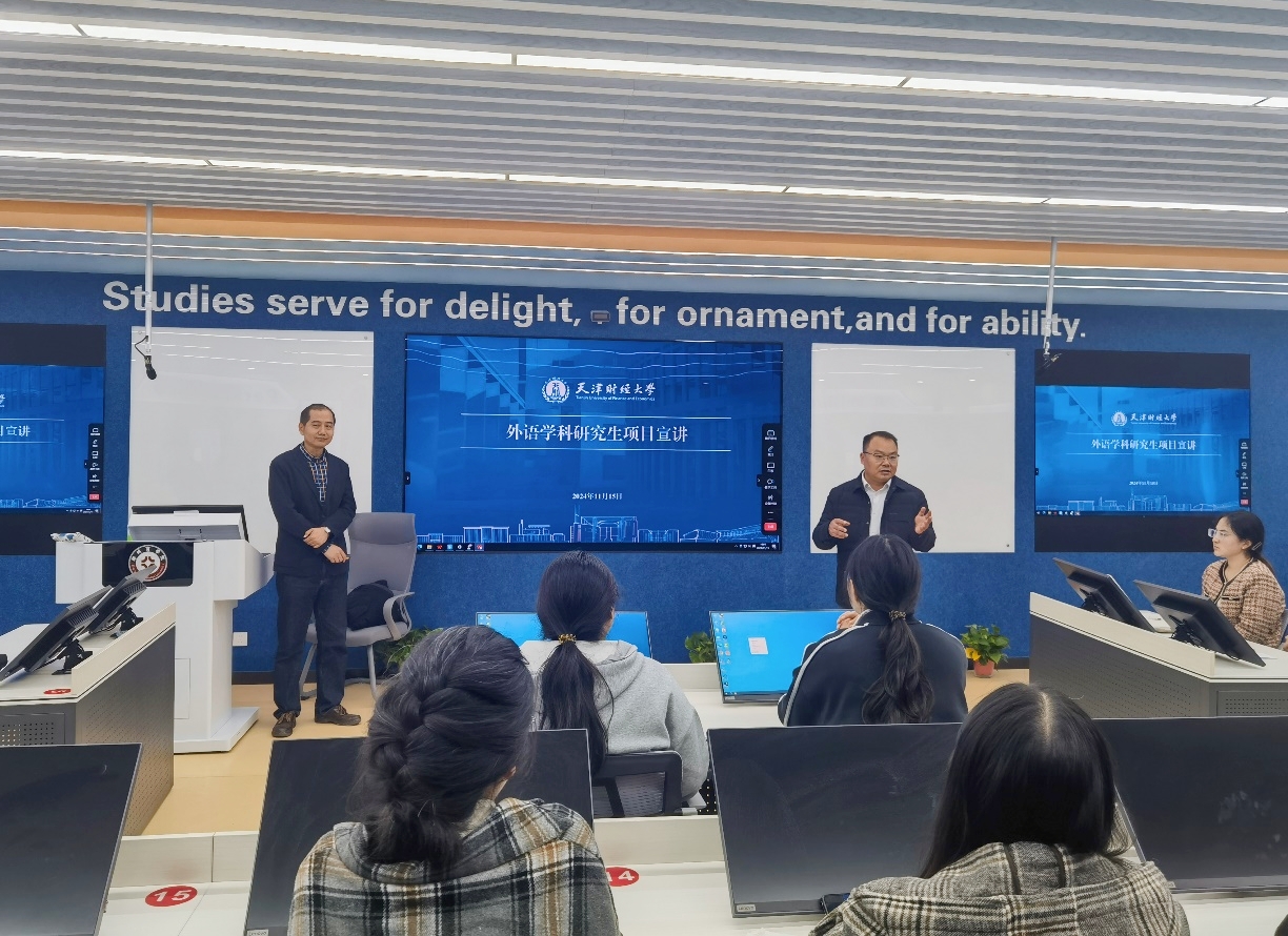 为服务外国语学院学子考研需求,帮助学生开拓择校视野,明确考研目标,了解目标院校的招生情况和要求,科学制定考研规划,同时加强校际交流,促进共同发展,在我院承办2024年iCAN大学生创新创业大赛“亿学杯”跨境数字营销挑战赛全国总决赛的契机下,我院考研教研室于11月15、16日在外语大楼101教室召开硕士研究生招生宣讲会,特邀请河南科技大学外国语学院岳中生副院长、天津财经大学人文学院张建东副院长、广西科技大学外国语学院MTI教育中心周照兴主任做研究生招生宣讲。此次宣讲会吸引了我院各专业百余名有考研意愿的学生报名参加。