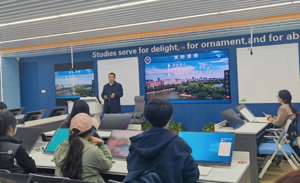 16日下午的宣讲会由翻译教研室主任郜万伟老师主持,广西科技大学外国语学院MTI教育中心周照兴主任进行宣讲。周主任详细介绍了广西科技大学外国语学院的基本情况,从学院的发展历程、师资力量到教学设施等方面,让同学们对该学院有了较全面的认识。周主任还介绍了广西科技大学MTI报考和招生情况,有助于同学们根据自身情况合理规划报考策略。
