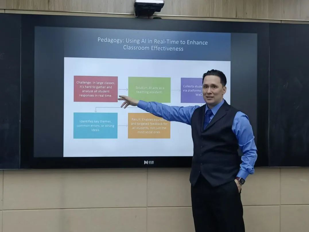 为紧跟外语教育发展步伐,推动教师思维碰撞与经验互鉴,提供英语授课教学经验交流平台,进一步提升教学质量与成效,11月22日,我院于W104开展以“Enhancing Teaching with AI”为主题的教师教学法英语沙龙活动。本次活动由外教Lorenzo主讲,外语学院教师积极参加此次活动。