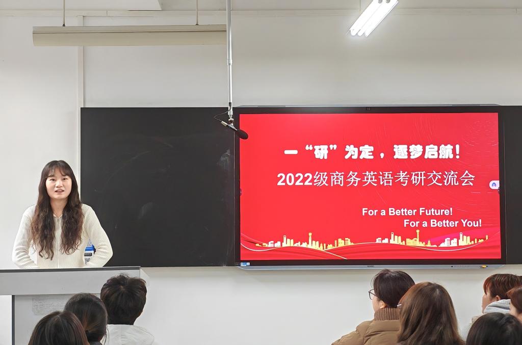 为扎实推进22商务英语专业分层分类教学,帮助22级考研学子明晰考研目标、合理选择考研院校及专业,商务英语专业特邀西北政法大学在读学子为22商本考研班学生进行考研学校及专业选择、复习规划等方面的经验交流与分享。商务英语教研室主任葛莹辉、考研负责教师张灿参加了交流会。