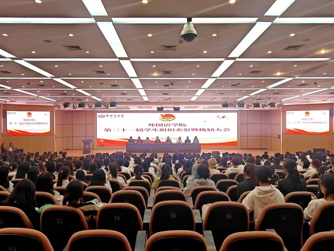 为推进外国语学院学生组织建设,发挥学生干部服务职能,增强学生组织队伍凝聚力,为学生会注入更多新的活力。10月16日19:00,我院于图书馆一楼报告厅隆重召开第二十一届学生组织表彰暨换届大会。我院党委书记王克志、团委书记王子浩、全体辅导员、二十一届学生组织全体成员、24级助理辅导员、三下乡先进个人、先进集体、二十届优秀学生干部、24级主要班委参会,本次会议由我院第二十一届团委副书记于吉增主持。