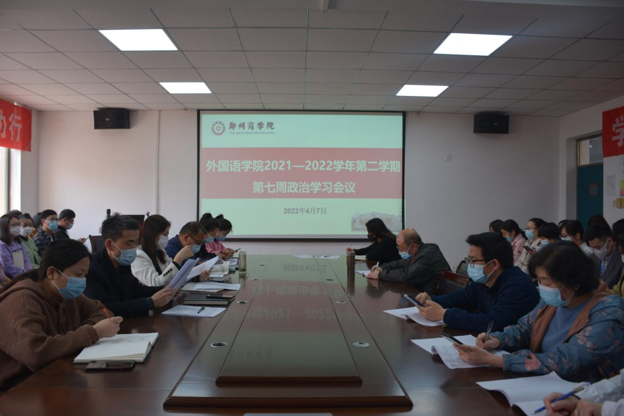4月7日下午,外语学院组织无课教职工在外语楼209会议室进行本周政治学习,会议由外语学院党委书记王克志主持。会议伊始,王书记带领大家认真学习了《习近平总书记关于能力作风建设的重要论述(一)——能力方面》,以及《999策略白菜手机论坛2021-2022学年第二学期第一次主管会暨工作计划汇报会会议纪要》。会上,王书记强调,“能力作风建设年”活动作为2022年的一项政治任务,要认真组织,扎实推进,确保活动取得满意效果,实现党员干部能力大提升、作风大转变,为推动我校事业高质量发展提供坚强保证。