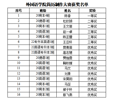 本次大赛通过简历制作,进一步加强了我校学生对自身的认识,指导毕业生做好求职准备,发展实践就业梦想,融入企业招聘渠道,培养自我展现能力的精神,为下一步实习工作的顺利开展奠定了基础。现将名单公布如下: