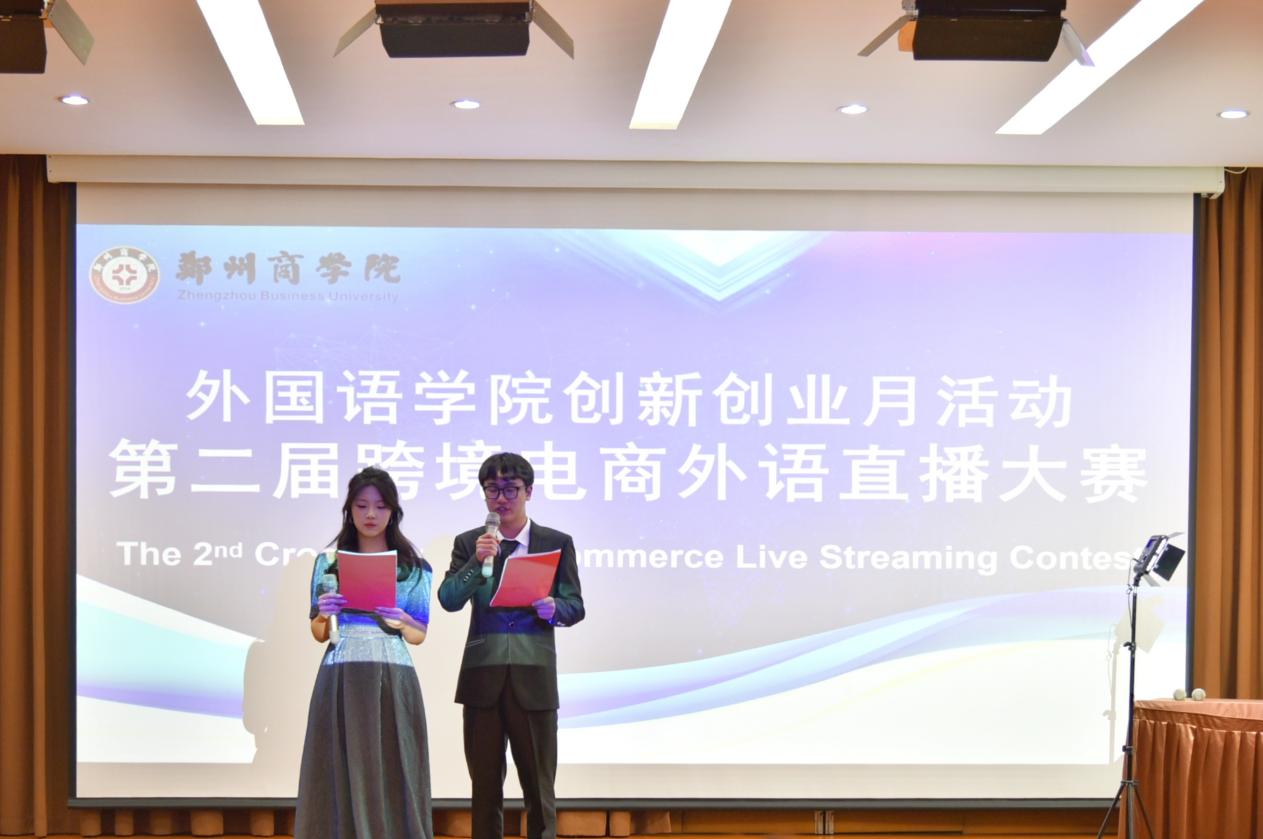 为积极顺应数字经济时代潮流,培养学生数字营销思维及跨境直播营销技巧,进一步激发学生的创新创业能力,12月19日,在图书馆五楼国际报告厅,我院举办创新创业系列活动暨第二届跨境电商外语直播大赛。管理学院院长李晓翠、我院副院长赵保成、巩义孝义宏英机械总经理刘音妍、河南澳腾环保科技有限公司业务经理刘云鹏出席,我院近500名学生观摩了此次比赛。