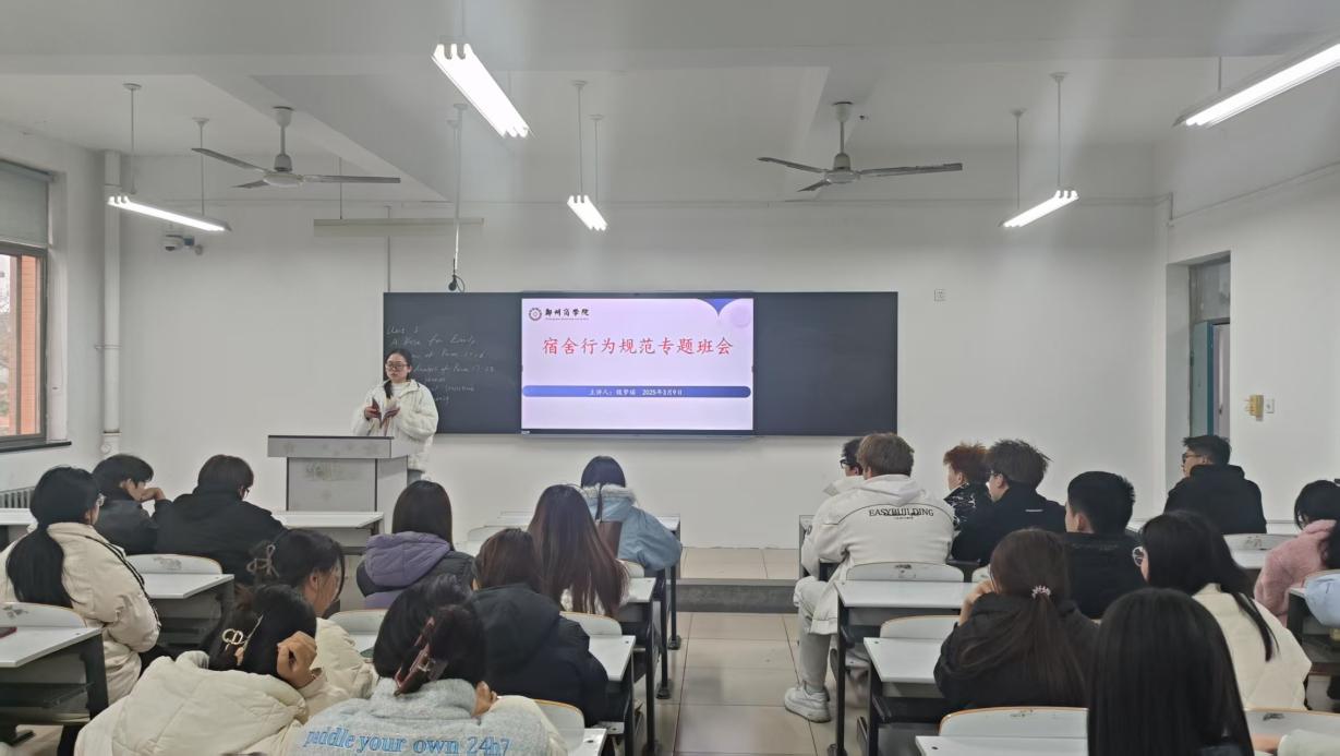 为进一步加强宿舍管理,提高学生的文明素养,营造一个更加温馨、整洁、有序、安全、和谐、美好的宿舍生活环境,我院于3月9日下午组织召开“规范宿舍行为,共建和谐宿舍”主题班会。