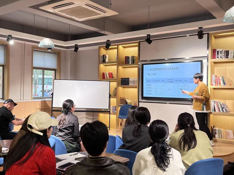 4月8日下午,大学英语第二教研室在W102召开了大学英语教学分享交流会,会议由郑丹阳老师主持,全体教师参加了分享会。首先,理工24级课程组闫锐老师进行了大学英语线上平台使用效果的分享。闫老师在智慧化教学赋能大学英语的趋势下,以线上平台为英语教学的辅助手段,将线下学习与线上学习有机融合。每周在微信公众号“词达人”上发布三个与课文、四级和思政有关的词汇任务;单元结束后在iTEST上各发布一次词汇检测和翻译练习;每周在FiF上发布两个与课文主题相关的朗读任务和四级真题听力任务;每单元结束在iWrite上发布一次作文并鼓励学生根据修改意见多次修改。通过以上线上平台的使用,不仅提升了学生的语言运用能力,更培养了学生自主安排学习计划、自我管理以及自我监督的自主学习能力。