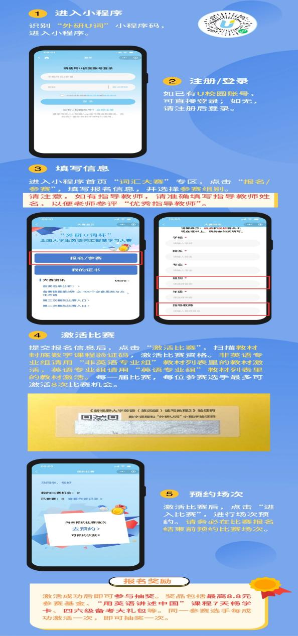 大赛依托“外研U词”微信小程序举办。本次大赛为公益赛事,不收取报名费。有意参赛的学生可按照以下步骤自主报名。