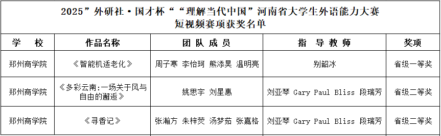 2025年10月28日,“外研社·国才杯”“理解当代中国”河南省大学生外语能力大赛短视频大赛在郑州大学圆满落幕。作为检验高校外语教学成效与学生国际传播能力的重要赛事,本次比赛以“美丽中国”为主题,吸引省内41所高校同台竞技,经过初评、复评及终评的层层遴选,我院三支参赛团队脱颖而出,分别斩获1个河南省一等奖、2个河南省二等奖。