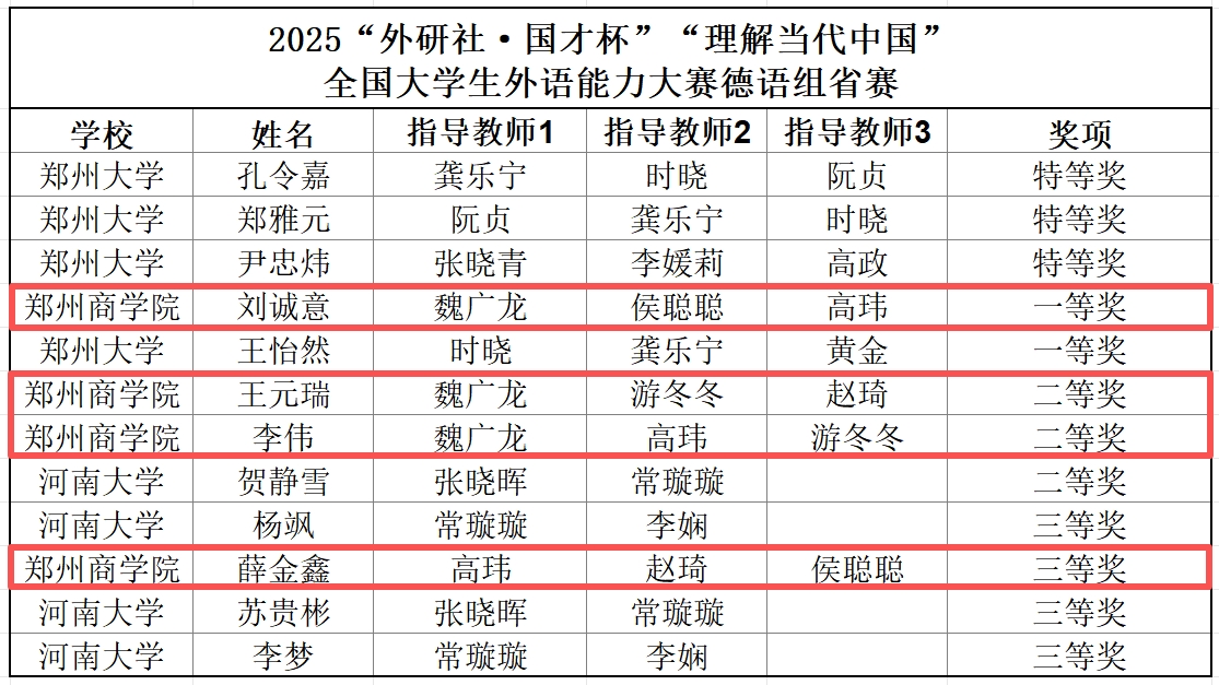 此次获奖是我院德语专业持续深化教学改革、注重实践能力培养的又一成果。德语专业师生将以此为契机,继续深耕德语语言学习,提升跨文化传播能力,以赛促学、以学促行,为用多语种讲好中国故事、传播郑商声音贡献更多力量。