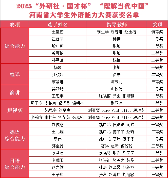 近日,2025“外研社・国才杯”“理解当代中国”河南省大学生外语能力大赛圆满落幕。我院学子与全省各高校优秀选手同台竞技,凭借稳健发挥斩获佳绩,共揽特等奖1项、一等奖8项、二等奖7项、三等奖5项,总计21项荣誉。