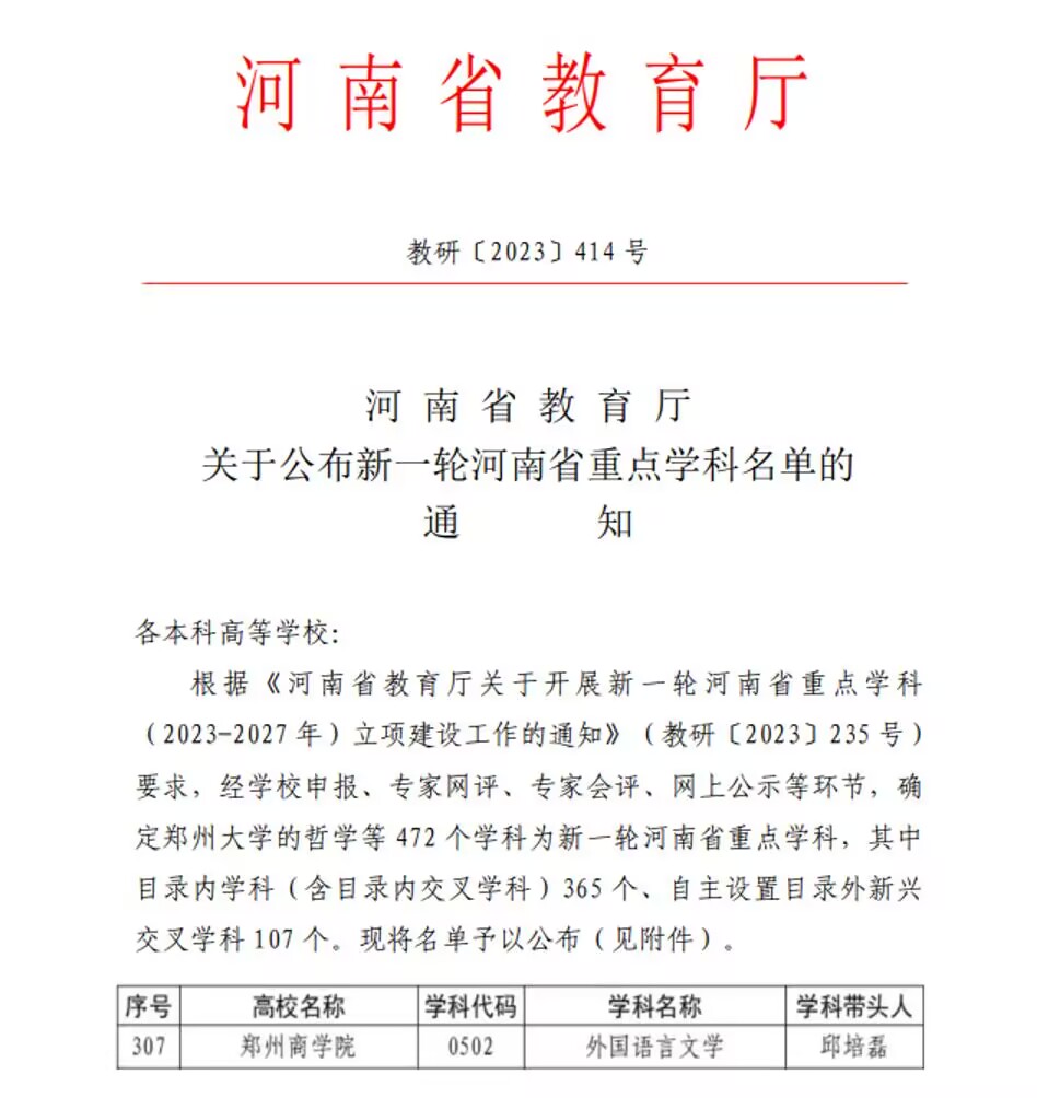 根据《河南省教育厅关于开展新一轮河南省重点学科(2023-2027年)立项建设工作的通知》(教研〔2023〕235号)要求,经学校申报、专家网评、专家会评等环节,我院外国语言文学立项为河南省重点学科。