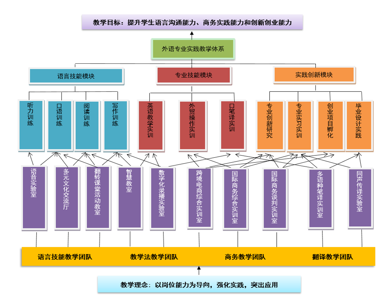 学院秉持“以专业能力培养为核心、以职业能力培养为导向、突出应用”的教学理念,依托商务外语实验中心,建立了以专业能力目标为引领,以专业教学团队为保障,分模块有序推进的实践教学体系,形成了外语学院“教-学-练-评-测-创”的实践教学模式,开展了系统多样的语言和专业实践教学任务,搭建了良好的校内实践育人平台。