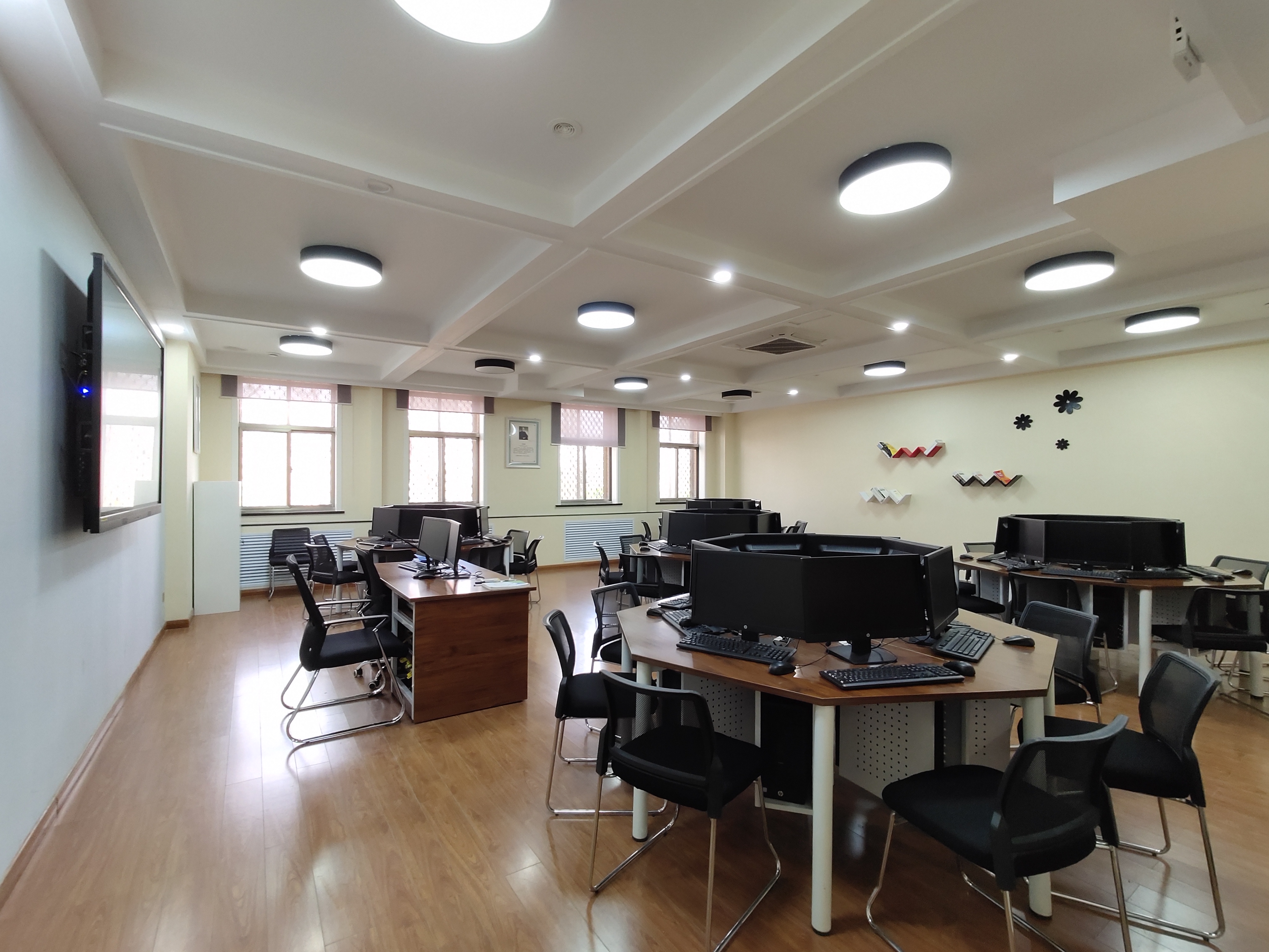 实验室有40个教学座位,能满足一个自然班的翻译教学与实训。实训室配备了交互式多点触控屏、中央空调和除霾系统,为学生提供温馨、舒适的学习环境。