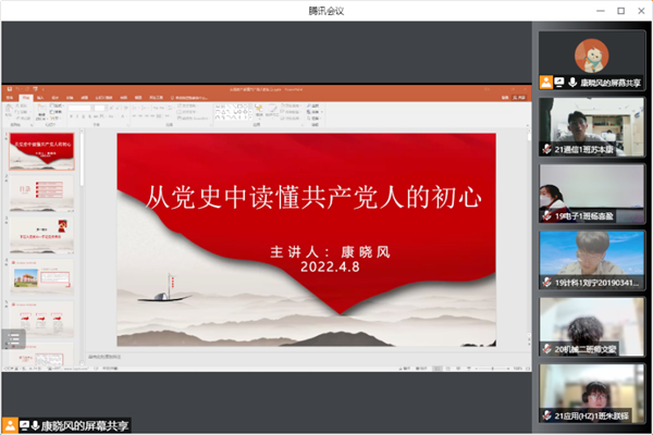 2022年4月8日,信息与机电工程学院举办第三十四期入党积极分子培训班线上党课第四讲。参加线上党课的有信工学院学生第四党支部宣传委员康晓风老师,第三十四期入党积极分子的同学们。