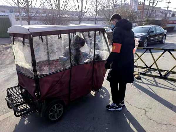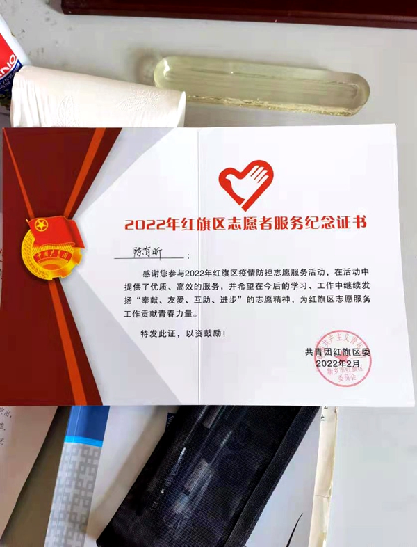 在抗击疫情的紧要关头,陈有昕同学在新乡市红旗小店镇北街村当一名防疫工作志愿者,在当地村口疫情防控卡点处指导人员有序扫码进出,帮助返乡人员进行信息登记,进行外地人员劝返工作,同时还利用自己所学的知识协助村委会普及疫情防控知识,用实际行动为村民筑起安全墙。