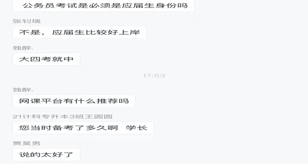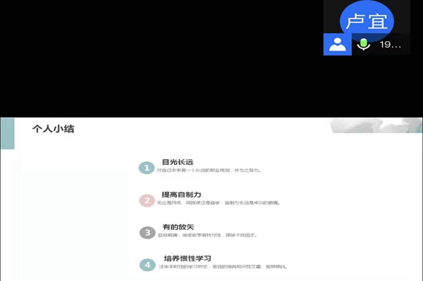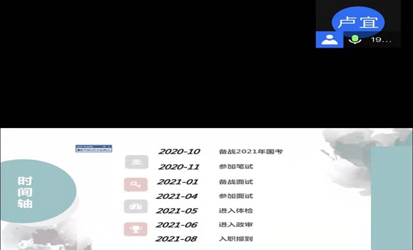 会上,卢宜同学就自身经历按照时间轴一项一项的分享了自己的备考时间安排和备考方式,同时分享了自己在考场答题的心得与体会和面试的过程。他让学生清晰认识公务员性质以及工作特点,建议学生做好自我定位,根据岗位性质以及自身性格特点决定是否报考公务员,如果确定目标,那么就要提高自制力,培养良好的学习习惯。