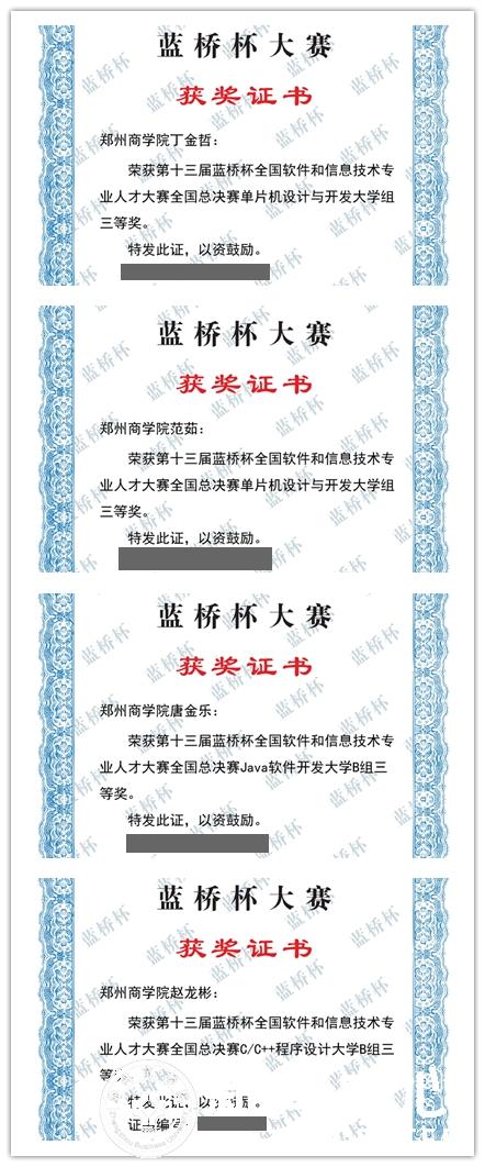 2022年6月27日,在公布的第十三届蓝桥杯(软件类)全国软件和信息技术专业人才大赛国赛成绩中,999策略白菜手机论坛代表队选手在参加的C/C++程序设计、Java软件开发、单片机设计与开发三个比赛项目中共斩获20项奖项,其中我校4名选手唐金乐,赵龙彬,丁金哲和范茹获得蓝桥杯国赛三等奖,另有十余名选手均获得了蓝桥杯国赛优秀奖。