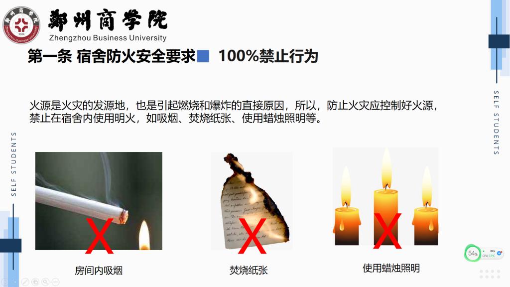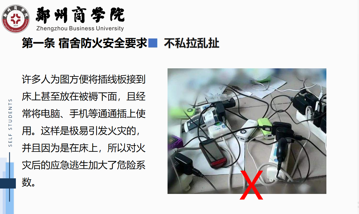 随后,22级新生辅导员以真实案例生动的向同学们阐释宿舍安全的重要性,宿舍安全隐患处处存在,人人树立安全意识,采取安全措施,严加防范。同时,辅导员们强调宿舍安全需要全体师生的共同努力,不断提高学生综合素质和自我普及宿舍安全知识,不断增强学生安全意识和自我管理,自我教育,自我服务的能力,从而营造一个安全,和谐,整洁,舒适的学习休息环境。