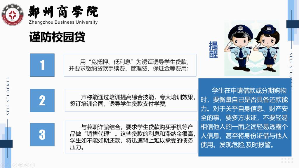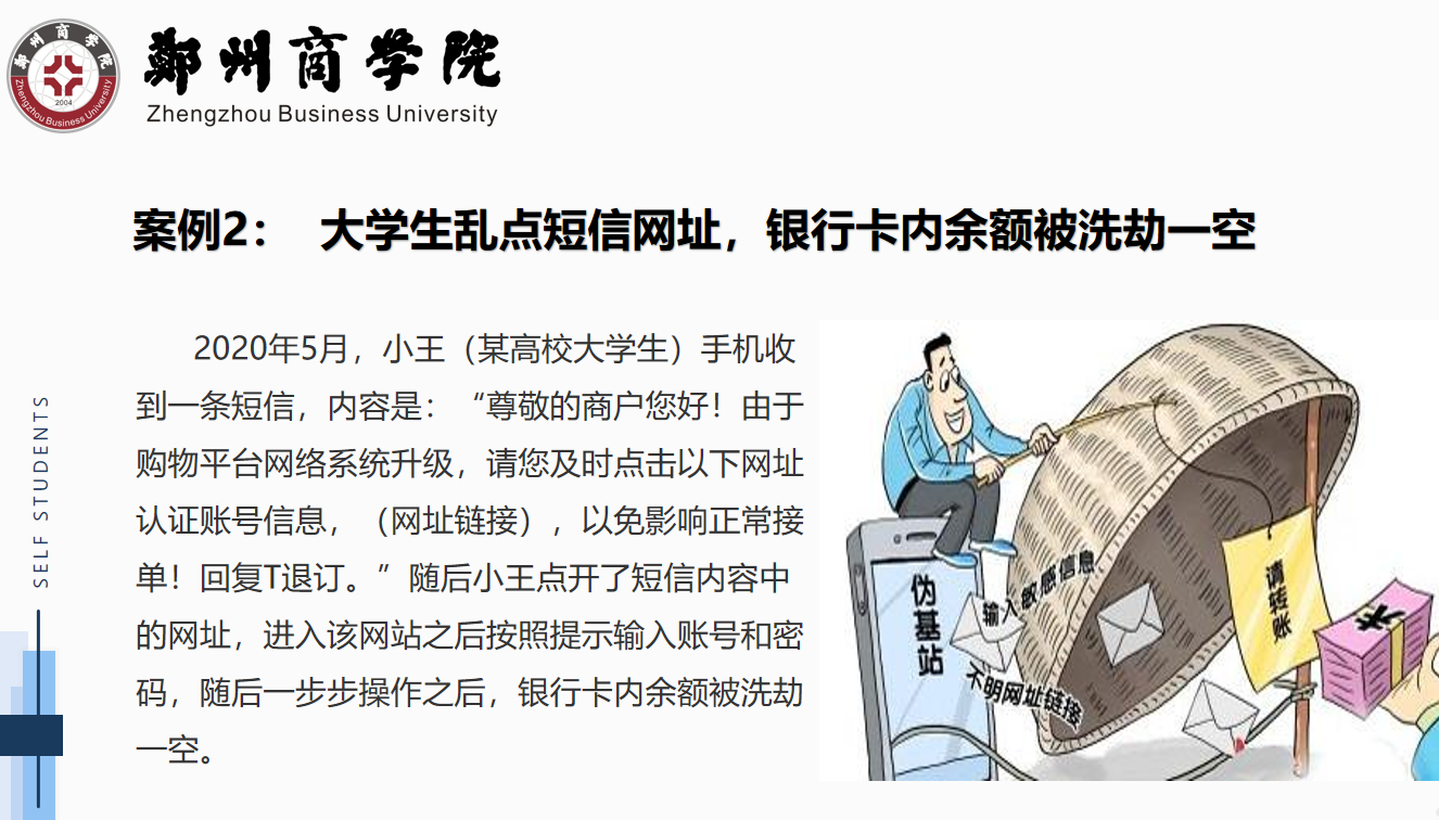 校园网络诈骗日剧严重,成为校园安全的一颗潜在毒瘤。其中,大学生开学季既是这颗毒瘤爆发的“高发季”。会议初,辅导员结合各大高校曾经发生过的的几起实际案例来引出今天得班会主题——防诈骗,其中又通过近日的时政、新闻等信息抛砖引玉,为同学们生动形象的科普了日常生活中的诈骗手段,让同学们学会预防电信诈骗,增强了同学们的防范意识,同时也提醒同学们有事找老师,有事找学院。