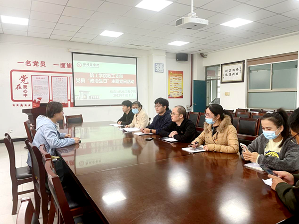 11月1日,教工支部在4号楼一楼会议室为17名党员同志庆祝其“政治生日”。同志们逐一分享了自己的入党经历,同时畅谈在教学过程中如何将“课程思政”元素融入课堂教学中,如何发挥党员的先锋模范作用,以及在党的二十大召开后,如何进行学习和贯彻的。“政治生日”让党员重新回忆党组织的培养历程,强化党员身份意识、宗旨意识,传递党组织的关心、希望和鞭策,提醒激励党员不忘教育初心,牢记育人使命,激发工作热情,以昂扬的姿态建功新时代,奋进新征程。