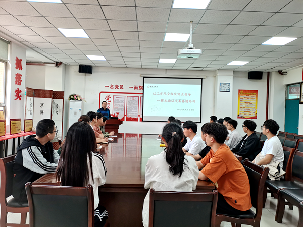 针对20级学生,我院开展线下模拟面试比赛。本次模拟面试比赛包括简历筛选、线下面试两大环节。学院初赛的简历初筛环节共有589人投递简历,其中15人成功进入线下模拟面试环节。为助力参赛学生全力备战信息与机电工程学院模拟面试比赛,学院于5月11日4号楼104会议室开展赛前培训。本次培训特别邀请了河南奇酷网络工程有限公司李志涛总监为同学们进行了面试技能培训。