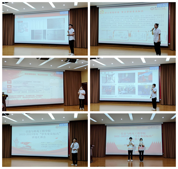 为深入学习贯彻党的二十大精神,扎实推进主题教育,进一步增强团队凝聚力、向心力和战斗力,激励引导广大师生坚定不移听党话、跟党走,坚定信心、奋勇争先,落实日常考评和年终考核程序,促进支部、党员之间的交流,创新工作开展思路,营造争先创优的良好氛围,信工学院于6月26日晚18:00在图书馆五楼报告厅2022-2023学年“学生党员标兵”评选汇报会。