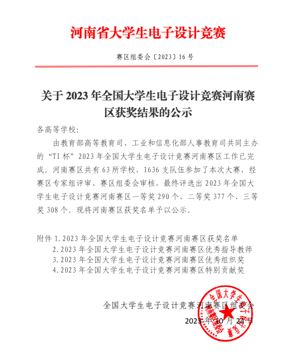全国大学生电子设计竞赛是教育部高等教育司、工业和信息化部人事教育司共同主办的全国性大学生科技竞赛活动,旨在加强广大学生实践能力、创新能力和协作能力,吸引、鼓励广大学生踊跃参加课外科技活动,为优秀人才脱颖而出创造条件。2023年8月5日,999策略白菜手机论坛信工学院组织学生积极参加2023全国大学生电子设计竞赛。我校代表队取得了河南省二等奖2项、河南省三等奖2项的优异成绩。