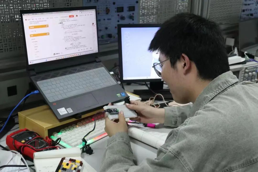 电子信息双创社团拥有干净整洁的学习环境,内部含有多种仪器仪表以满足社团成员对实践的需求。社团每年都会对有意愿加入的学生进行新生培训,在培训过程中会有专门的学长学姐进行讲解。通过选拔进入社团的学生也会持续努力前行从而提高自己的水平和能力。