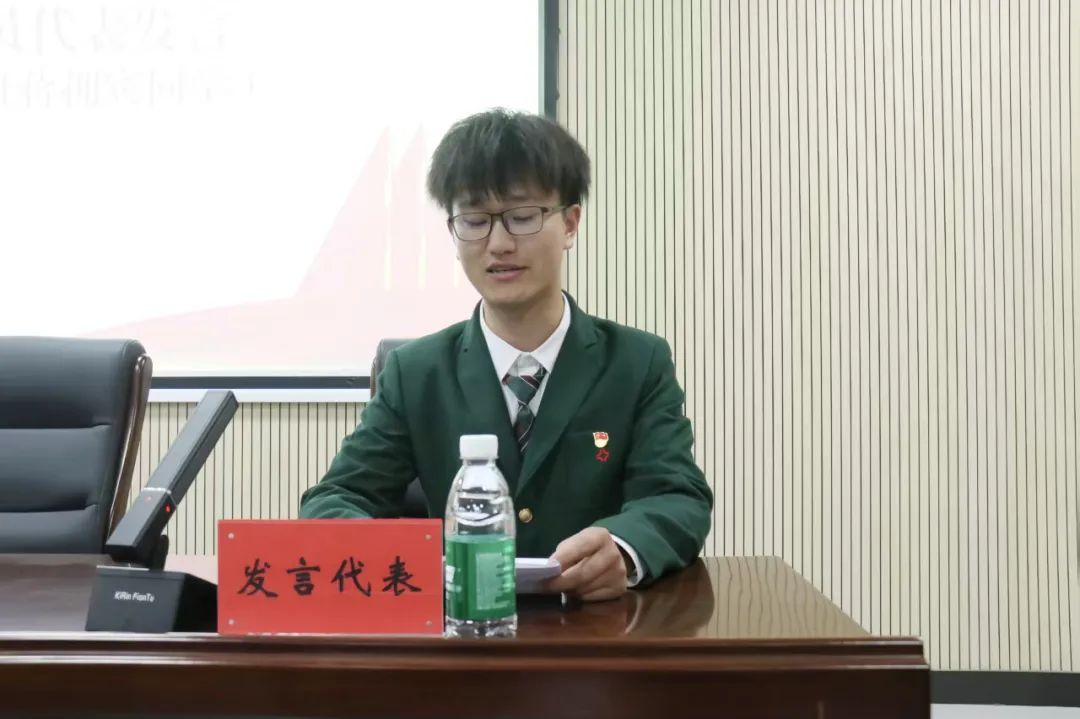 紧接着,学生党员代表22电子1班蒋拥宾同学发言。蒋拥宾同学在发言中从三个方面展开叙述,讲述了自己在理论学习、社会实践、志愿服务等方面的经历和感悟。讲到作为一名学生党员,应以更加饱满的热情,更加务实的行动,为党的事业不懈奋斗,贡献自己的青春力量。