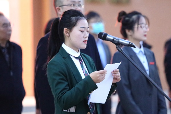 学生代表、工商学院赵海青同学向全体同学发起倡议:一要遵规守纪,规范行为。遵守学校疫情防控常态化要求,遵守校规校纪,规范自身行为;二要积极进取,刻苦学习。努力提高自己的专业知识水平,独立思考、虚心请教、奋发图强;三要爱国爱校,奋勇拼搏。认真践行“勤俭 朴实 自力 更生”的校训,在校园生活中提高自己、充实自己。