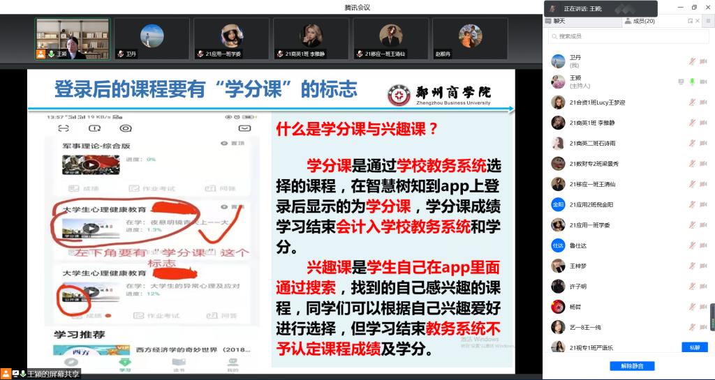 为更好地发挥课堂育人的主渠道作用,帮助学生了解和适应《心理健康教育》网络课程的学习方式,心理健康教育中心于3月23日中午在腾讯会议召开了网络课程学习培训会,本学期开课的16个专科班级学委参加了会议。会议伊始,心理健康教育教研室主任王小颍老师强调了心理健康教育课程开设的意义,并就课程的开课方式、运行时间、考核方式和操作指南进行了深入解读和操作演示。最后,针对各班学委提出的具体疑问进行了细致解答,并对课程的学习方法和学习目标提出了建议和期待,希望通过心理健康教育课程的学习,使学生明确心理健康的标准及现实意义,掌握必要的心理健康知识,培养良好的心理素质,为学生更好的适应大学生活、促进全面发展和整体素质的提升奠定基础。