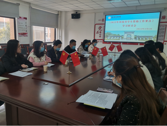 4月6日下午,学务处劳卫科在亚泽楼113会议室组织召开学习研讨会议,集中学习了《2022年河南省学生资助工作要点》。劳卫科李准科长、王晶晶老师,各院部资助专员参加了会议。会上,李准科长围绕2022年我校学生资助工作做出指导意见,各院部资助专员结合工作实际,进行交流发言。