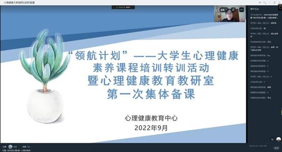 9.2日下午,心理健康教育教研室组织开展了“领航计划”——大学生心理健康素养课程转训暨第一次集体备课活动。本次活动通过钉钉直播进行,由教研室卫丹老师主讲,心理健康教研室全体专兼职教师参加。