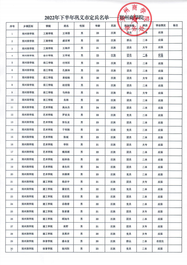 经过“网上报名、体格检查、心理测试、政治考核、役前教育训练”等环节,巩义市征兵工作领导小组定兵会议研究通过,确定我校王译国等30名同学为2022年下半年应征入伍定兵对象,现根据相关规定予以公示,人员名单如下: