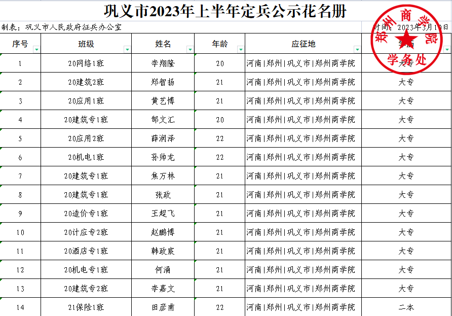 经过“网上报名、体格检查、心理测试、政治考核、役前教育”等环节,巩义市征兵工作领导小组定兵会议研究通过,确定我校李翔隆等14名同学为2023年上半年应征入伍定兵对象,现根据相关规定予以公示,人员名单如下: