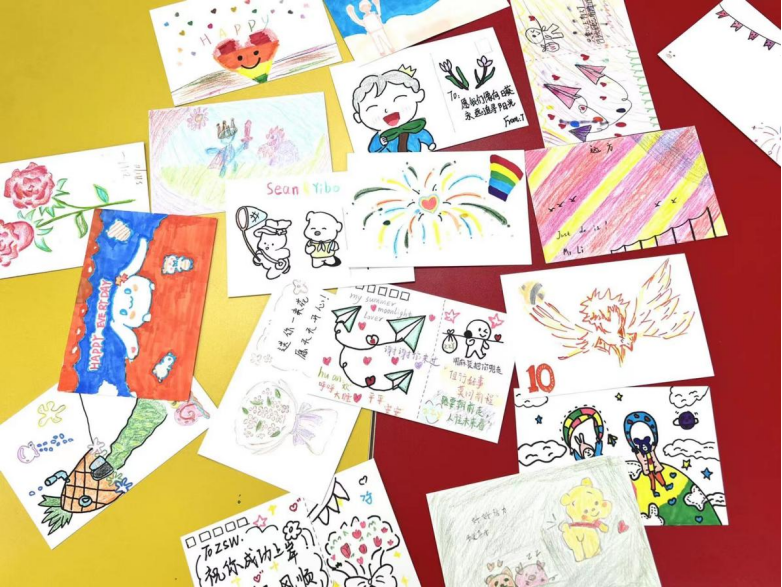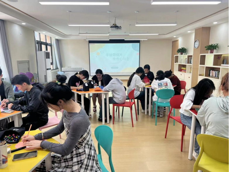 活动主要分为三个阶段。首先李老师通过什么是潜意识、如何表达自我以及绘画在心理学中的有效运用等三个方面来阐述本次活动内容,并以简单的热身活动带领大家进入手绘明信片活动主题。随后同学们在柔美的轻音乐中以平和的心态,用画笔在图纸上创作,笔尖与画纸的碰撞激起了学生创意的火花,每一张明信片都由独一无二的思想凝结而成,诉说着自己内心深处的话语。绘画完成后,李云佳老师鼓励大家就自己创作时的感受和想法进行分享,最后同学们带着作品面向镜头进行本期手绘明信片的收尾合影。