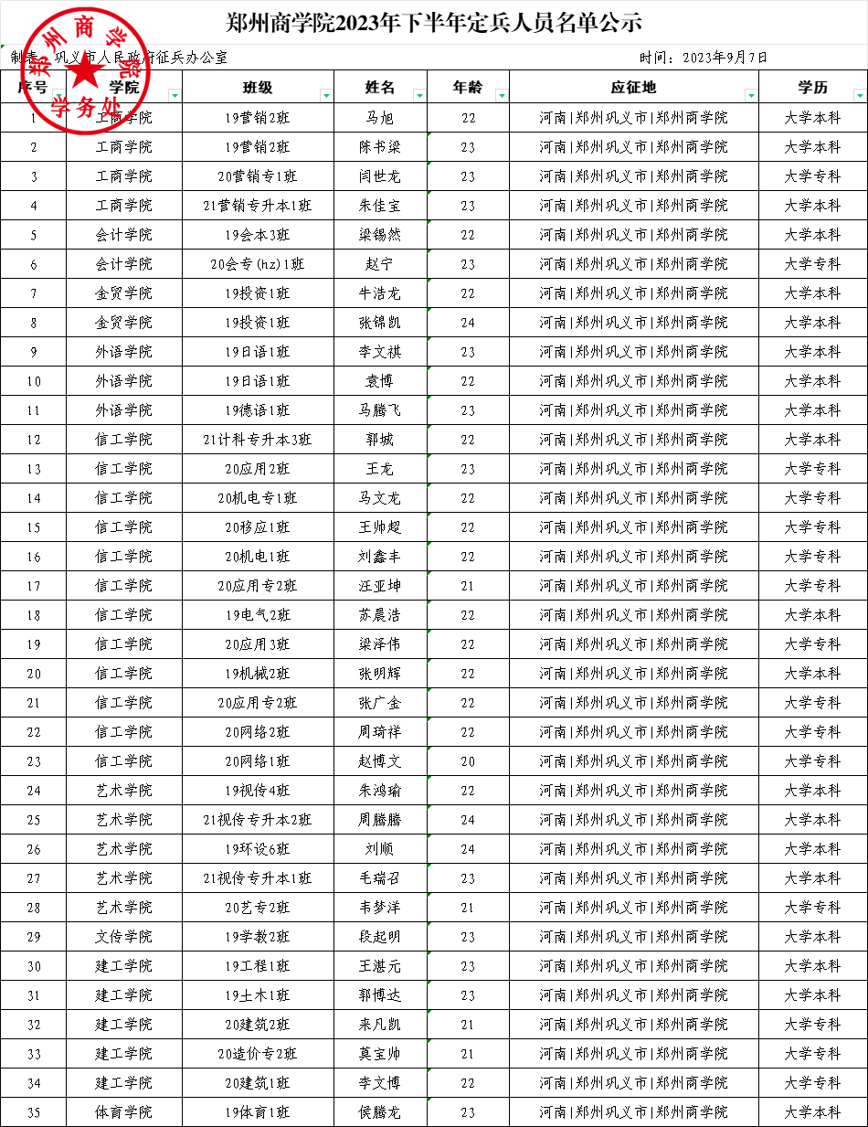 经过“网上报名、体格检查、心理测试、政治考核、役前教育”等环节,巩义市征兵工作领导小组定兵会议研究通过,确定我校马旭等35名同学为2023年下半年应征入伍定兵对象,现根据相关规定予以公示,人员名单如下: