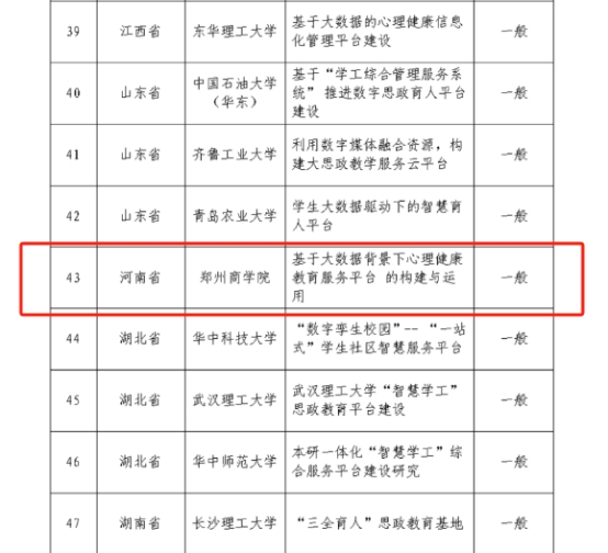 近日,中国高等教育学会发布高校数字思政精品项目(第二批)拟立项名单公示消息,我校申报的“思政教育智慧平台类”项目,成功进入拟立项名单。本次思政教育平台类项目,全国共有包括北京化工大学、中国民航大学、东北师范大学等在内的61所高校进入拟立项名单,我校是河南省唯一一所“高校数字思政精品项目”立项高校。