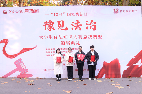 12月4日,由河南法制报、顶端新闻主办的12.4国家宪法日“豫见法治”河南省大学生普法知识大赛总决赛在郑州工商学院举行。我校信工学院团委书记张璐阳带领3名学生参赛。据悉,我省共有5支代表队入围决赛。经过激烈角逐,我校代表队荣获“三等奖”,我校喜获“优秀组织奖”。