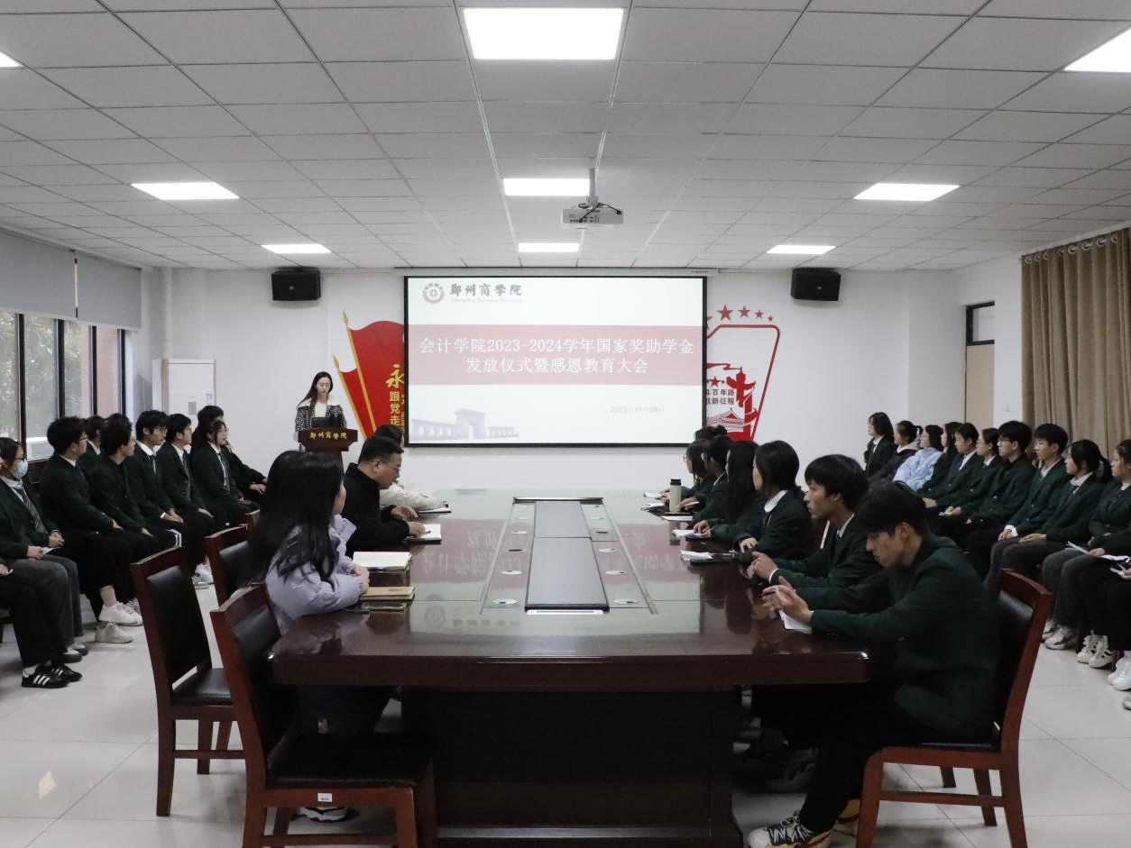 为贯彻落实国家资助政策,确保会计学院奖助学金发放到位,鼓励优秀学子不断成长,学会感恩。11月29日,会计学院在广恩楼103会议室举行了2023-2024学年国家奖助学金发放仪式暨感恩教育大会。会上,党委书记刘宏涛作出总结讲话,他希望同学们正确认识奖助学金的意义,长存感恩之心,珍惜时光,向优秀看齐,努力奋进,同时爱国爱校,不断提升自己,立志成才,回报社会。通过此次国家奖助学金发放仪式暨感恩教育大会,同学们感受到了国家和学校的关怀与帮助,接下来他们将继续努力,苦练技能,争做优秀的郑商学子。