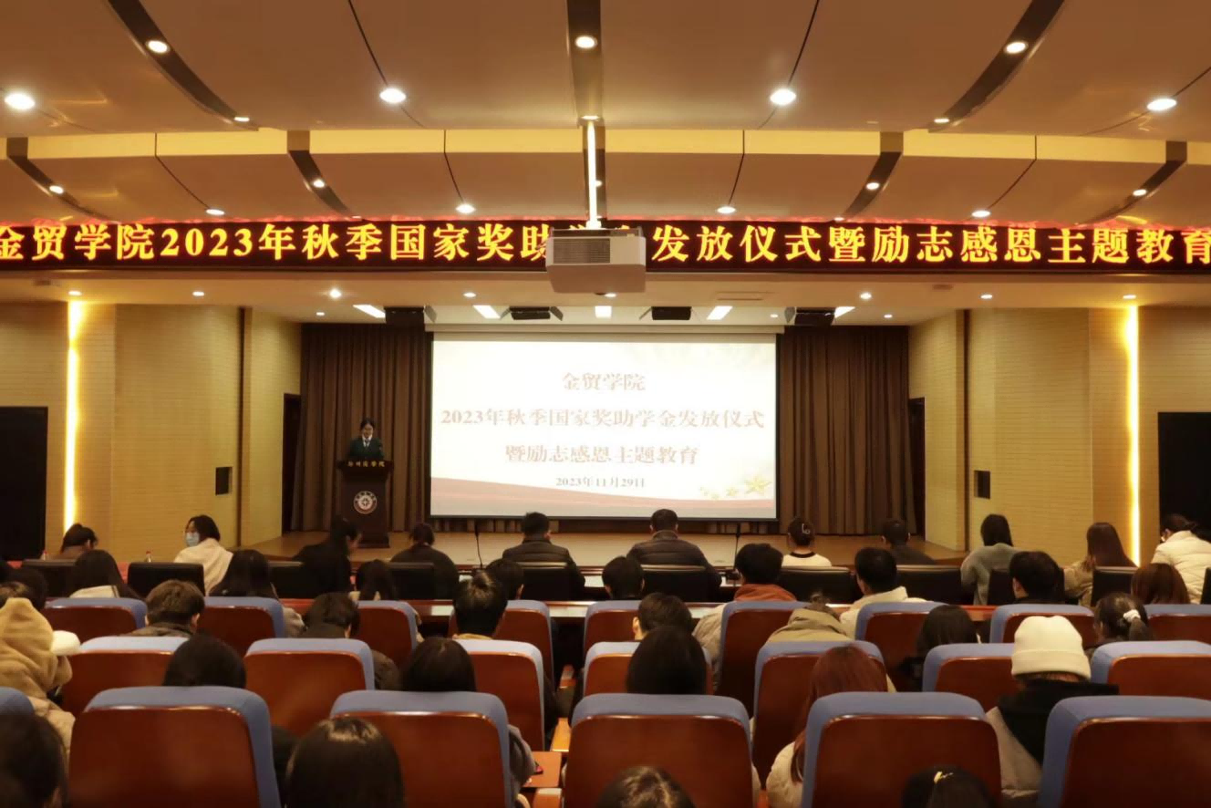 为了鼓励经济困难学生勤奋学习,努力进取,在德、智、体、美、劳等方面全面发展。引导学生树立励志成才、知恩感恩的意识。金贸学院于11月29日晚上在图书馆五楼报告厅开展“2023年秋季国家奖助学金发放仪式暨励志感恩主题教育”。会上,获得国家励志奖学金和助学金的学生代表发言。随后,资助专员王柳雅老师寄语,希望获得奖学金的同学们长存感恩之心、常怀高远之志。最后,党委书记吕鹏深情寄语,希望获得资助的同学提高自律能力,不盲从,不偏离初心,把时间和精力用在学习知识和提高本领上,继续发扬艰苦奋斗、勤俭节约的精神,不辜负国家和学校的培养。